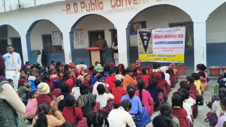रतनपुरा/पहसा(मऊ)।निकटवर्ती क्षेत्र अंतर्गत आर. डी. पब्लिक कान्वेंट स्कूल बकुची एवं श्रीमती लालती पब्लिक स्कूल प्रांगण में सौहार्द एवं बंधुत्व मंच के तत्वाधान में भारतीय संविधान जागरुकता यात्रा एवं संगोष्ठी का आयोजन किया गया।कार्यक्रम में संविधान के महत्व, उसकी मूल भावना और नागरिक अधिकारों पर विस्तार से चर्चा की गई।